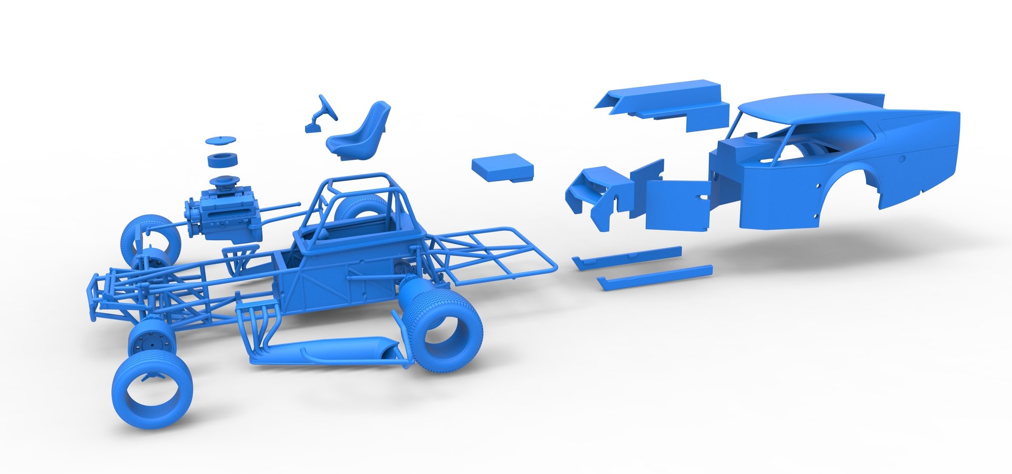 The model consists of parts: Air filter cap, Air filter, Centerlock nuts, Engine, chassis, Front left rim, Front left tire, Front right rim, Front right tire, Front rim hubs, Hood, Left bumper, Left exhaust, Left inner plate, Left side plate, Nose, Radiator, Rear left tire, Rear right tire, Rear rims, Right bumper, Right exhaust, Right inner plate, Right side plate, Seat, body, Shifter, Steering rod, Steering wheel, fuel Tank.