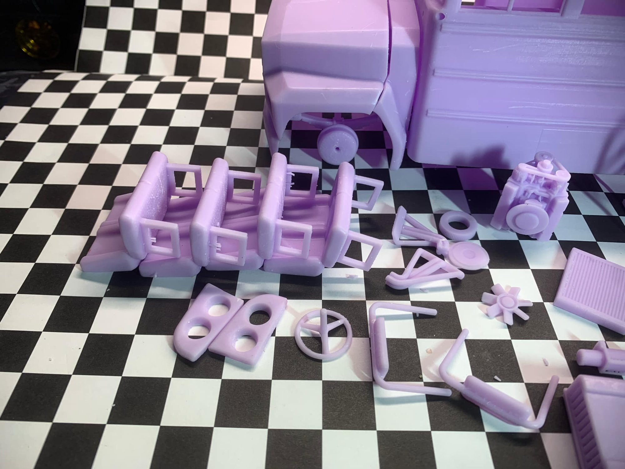 The model consists of parts: Air filter cap, Air filter, Driver seat, Engine, Fan, Frame part 1,2, Front bumper, Front grid, Front rims, Front top lights, Left exhaust pipes, Left top plate, Long insert plates, Mirrors, Passenger seats, Radiator, Rear hook, Rear inner rims, Rear outer rims, Right exhaust pipes, Right top plate, Rod, body part 1-6, Shifter, Short insert plates, Steering wheel, fuel Tank, Tires, Wheel stand, Winch, removable top , separate top, ac unit , and wheel ramps