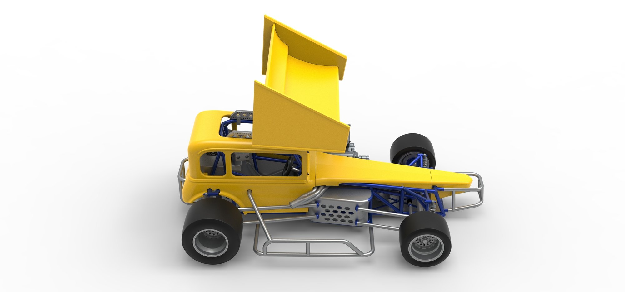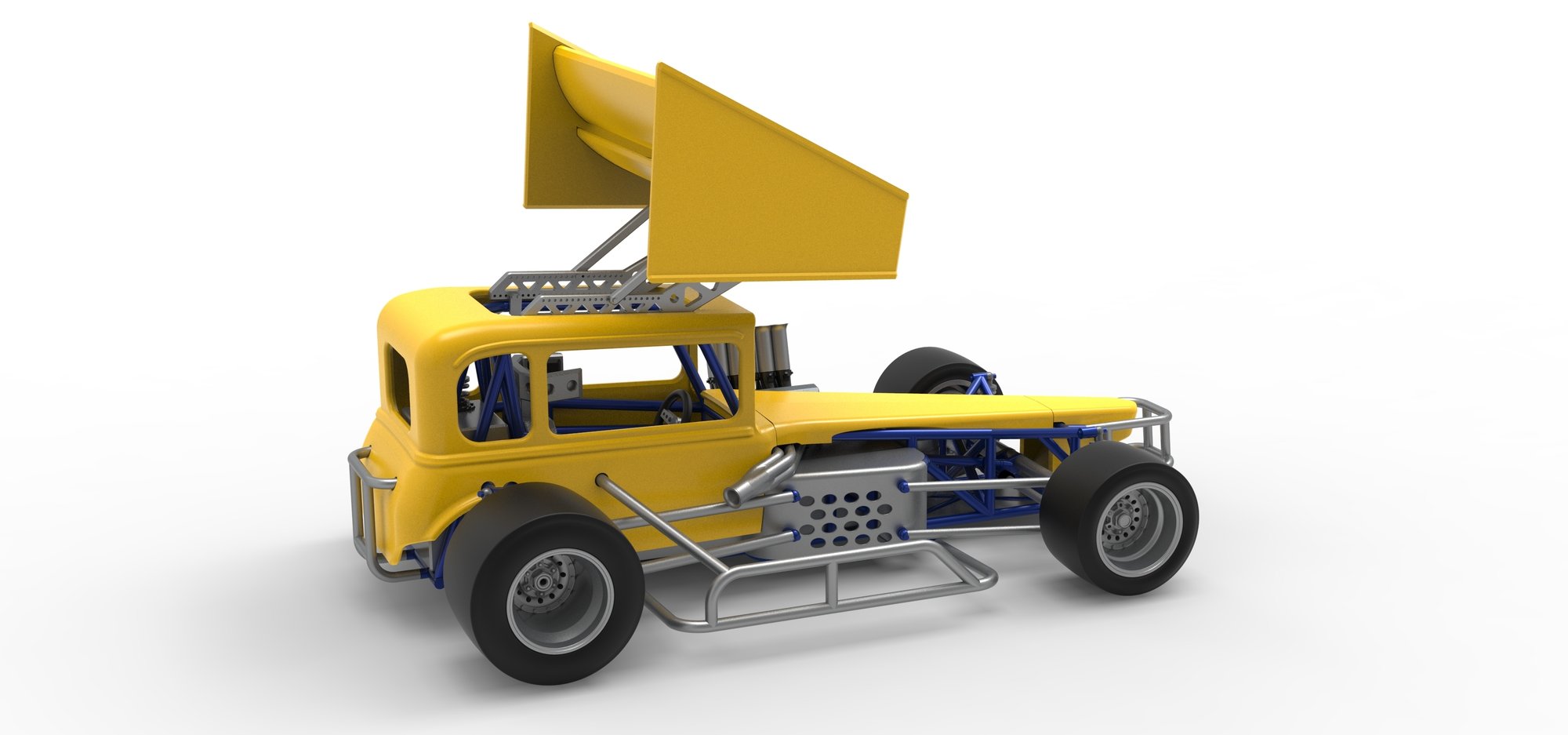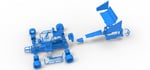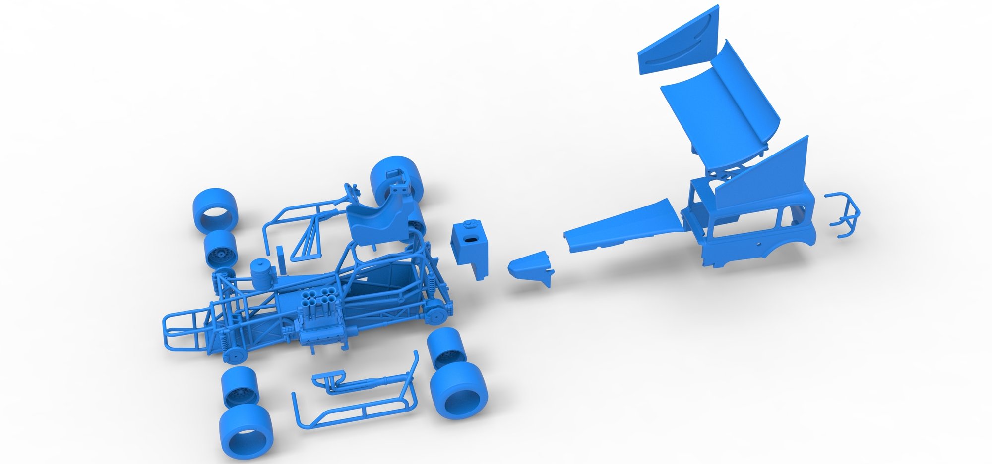 The model consists of parts: Air intake, Engine, chassis, Front rims, Front tires, Fuel cap, Hood, Left bumper, Left exhaust, Nose, Oil tank, Radiator, Rear bumper, Rear left rim, Rear left tire, Rear right rim, Rear right tire, Right bumper, Right exhaust, Seat, ford body, Shifter, Steering wheel, fuel Tank, Top wing central part, Top wing left part, Top wing mount, Top wing rear part, Top wing right part.